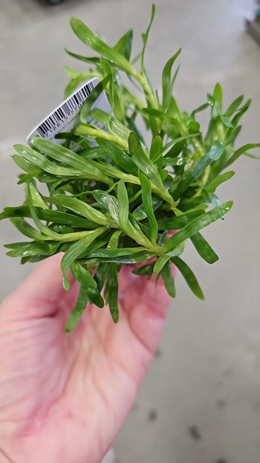 Callitriche palustris, beter bekend als Sterrenkruid, is een decoratieve, lichtgroene aquariumplant die direct opvalt door zijn fijne, smalle bladeren en unieke stervormige groeipatroon. Met bladeren van slechts 3 tot 5 cm lang en circa 5 mm breed, vormt deze plant bij bovenaanzicht prachtige stervormige rozetten – vandaar ook de toepasselijke Nederlandse naam.