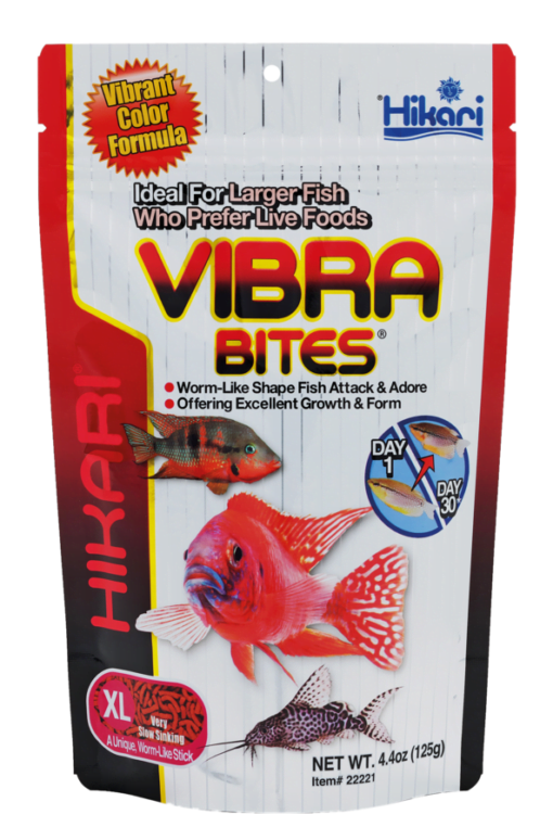 Hikari Vibra Bites zorgt voor uitzonderlijke, briljante en levendige kleuren. Door de wetenschappelijke en bijzonder voedzame samenstelling zijn de groei en kleurverbetering van de vissen al binnen één maand zichtbaar. Het voer kan gevoerd worden aan alle vissen die ook levend voer eten.