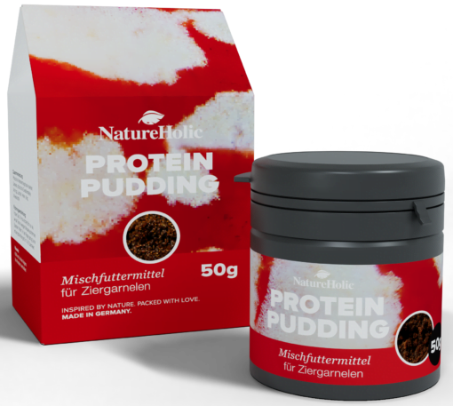 De Natureholic ProteinPudding bevat eiwitten en aminozuren uit natuurlijke bronnen: insecten en micro-organismen. Goedkope diermeel, vooral vismeel, vermijden wij bewust. Protein Pudding bevat minder dan 40% eiwit, wat vervellingsproblemen kan tegengaan. Een speciale watervrije voedingsoplossing geeft de pudding niet alleen zijn zachte consistentie, maar ondersteunt ook de vorming van nuttige biofilms op de oppervlakken in het aquarium. Ook de mineraalbehoefte van garnalen, slakken en krabben wordt gedekt met eiwitpudding; het voer bevat een mengsel van direct beschikbare organische mineraalverbindingen die niet moeizaam door het organisme hoeven te worden omgezet. Aan onze eiwitpudding hebben we ook montmorilloniet toegevoegd , dat verontreinigende stoffen kan binden en kan bijdragen aan een goede mineralenvoorziening. Het fruit, de groenten en de kruiden die in de eiwitpudding worden gebruikt, worden strikt en zorgvuldig gecontroleerd en voorzichtig rauw gedroogd. Hierdoor blijven vitaminen en mineralen optimaal behouden en gaan niet verloren.