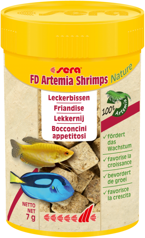 Sera FD Artemia Shrimps Nature is de natuurlijke, gezonde traktatie van 100% kleine artemia voor alle vissen en ongewervelde dieren in zoet- en zeewater. Tal van optimaal bruikbare eiwitten en omega-vetzuren ondersteunen een evenwichtige groei. Het hoge gehalte aan natuurlijke carotenoïden bevordert ook een optimale kleurexpressie en versterkt de afweer van het lichaam. oor de zachte vriesdroging blijven de waardevolle voedingsstoffen van de natuurlijke voeding volledig behouden.