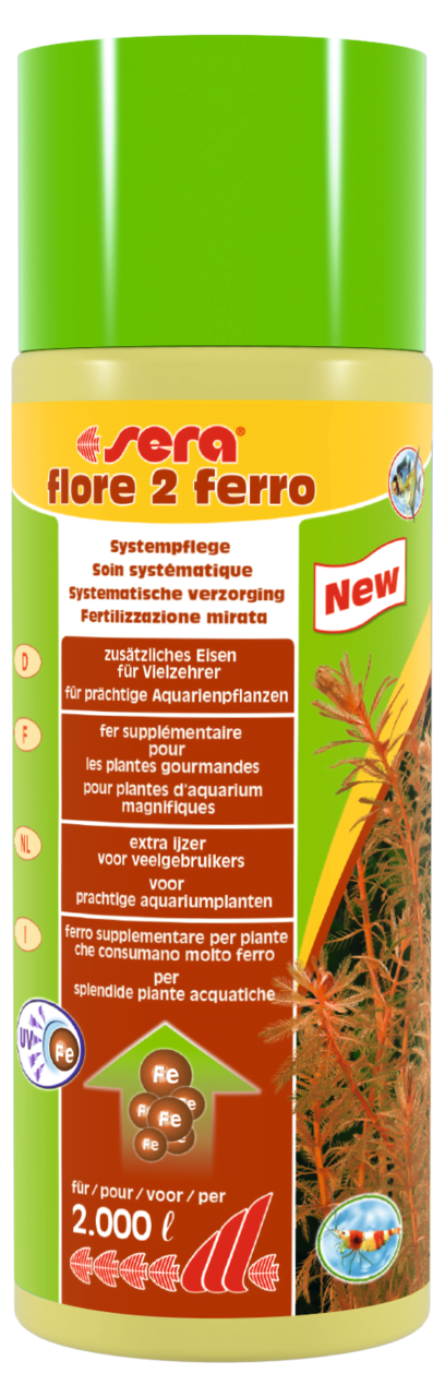 Rode of zeer snelgroeiende waterplanten hebben een bijzonder hoge ijzerbehoefte. Daarom komt ijzertekort vaak voor in zwaar beplante en intensief verlichte aquaria. De waterplanten hebben het ijzer echter nodig om hun volle kleurenpracht te ontwikkelen en voor een gezonde groei. Speciaal voor dit geval is de nieuwe systeembemesting sera flore 2 ferro ontwikkeld. Het voorziet de planten van voldoende ijzer en bevordert zo de kleurontwikkeling. Het bijzondere aan de nieuwe ijzermeststof sera flore 2 ferro is de lange beschikbaarheid. In veel aquaria worden UV-C waterzuiveraars gebruikt, die normale ijzercomplexen snel aantasten. Hierdoor is het ijzer maar heel kort beschikbaar voor de planten. Niet zo met sera flore 2 ferro. Het gebruik van speciaal gechelateerd ijzer zorgt voor een langdurige beschikbaarheid gedurende meerdere dagen. sera flore 2 ferro is nitraat- en fosfaatvrij en wordt goed verdragen door alle ongewervelde dieren.