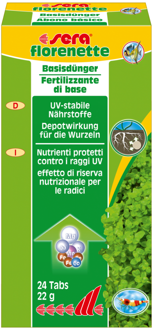 Sera florenette is de ideale basisbemesting voor overwegend voor waterplanten die via de wortel voeding opnemen. De bodemtablet voorziet waterplanten van alle belangrijke mineralen en sporenelementen voor een gezonde en kleurrijke groei. De speciale formulering zorgt voor een langdurige, gelijkmatige en uitgebreide toevoer, ook en vooral met het vaak beperkende ijzer. Effectieve natuurlijke groeibevorderaars zorgen voor een echte groeispurt, wat onder andere de groeifase aanzienlijk vergemakkelijkt. De meststof is nitraat- en fosfaatvrij. Het wordt goed verdragen door alle ongewervelde dieren. Door de goede groeisnelheid van de aquariumplanten krijgen algen geen kans zich te vermenigvuldigen.