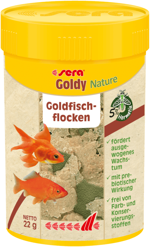 Sera Goldy Nature is het hoofdvoeder voor kleinere goudvissen en hun kweekvormen zoals bijv. B. Shubunkin, veiltail of sarasa en andere koudwatervissen, die geen kleurstoffen of conserveermiddelen bevatten.
