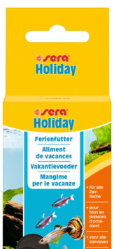sera Holiday is het vakantievoer van zorgvuldig vervaardigde voedertabletten, dat door de meeste siervissen goed wordt geaccepteerd. Het eiwitrijke voer wordt in lagen zacht van buiten naar binnen zodat alleen de buitenste laag wordt weggevreten. De rest van het tabblad blijft stabiel en fris. De vissen worden ruim 1 week goed voorzien van alle essentiële voedingsstoffen. Overeten is praktisch onmogelijk omdat het voer, dat slechts langzaam zacht wordt, door “weiden” moet worden verkregen. Het water is niet vervuild.
