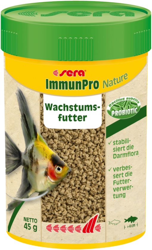 Sera ImmunPro Nature is het groeivoeder voor alle siervissen vanaf 4 cm. De probiotica, die via een bijzonder behoedzaam proces op het voer worden aangebracht, stabiliseren de darmflora van de siervissen en zorgen dankzij een efficiëntere voerconversie voor minder watervervuiling. Door het hoge eiwitgehalte van meer dan 50%, de toevoeging van probiotica en andere functionele ingrediënten zoals MOS, hematococcus (rijk aan natuurlijke astaxanthine) en spirulina bevordert het voer een snelle groei, krachtige ontwikkeling en schitterende verkleuring van de vissen. Met ImmunPro Nature heeft sera opnieuw een baanbrekende innovatie bereikt op het gebied van het voeren van siervissen. Dit uitstekende siervisvoer bevat voor het eerst de darmflora stabilisator Bacillus subtilis , die sinds juni 2016 is goedgekeurd voor siervissen en uitdrukkelijk wordt aanbevolen door de EFSA (European Food Safety Authority) voor gebruik in siervisvoer om groei en voerconversie te verbeteren. De geoptimaliseerde bruikbaarheid van het voer bevordert de snelle, evenwichtige ontwikkeling en gezondheid van de vissen op lange termijn. De versterkte dieren worden veel minder vaak ziek. Bovendien wordt de watervervuiling veroorzaakt door afvalproducten aanzienlijk verminderd. Door de groeibevorderende eigenschappen van het voer is het ideaal voor het kweken van siervissen.