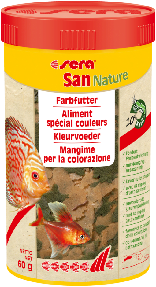 Sera San Nature is het kleurvoeder zonder kleurstoffen en conserveringsmiddelen voor alle aan de oppervlakte etende siervissen. De kleurontwikkeling wordt uitsluitend bevorderd door de natuurlijke ingrediënten zoals astaxanthinerijke Haematococcus-algen en krill.