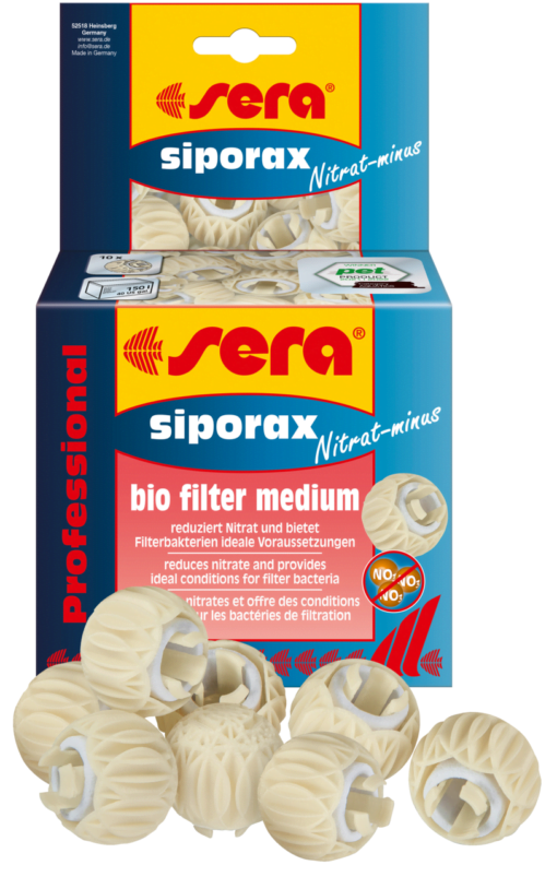 Sera siporax nitrate-minus professional is een krachtig filtermedium voor biologische nitraatafbraak met parallelle afbraak van nitriet en ammonium. De bol van biopolymeer, die is afgestemd op de siporax-ring, verhoogt en maximaliseert de denitrificatie optimaal. Het afbreekbare biopolymeer dient als koolstofbron voor de nitraat afbrekende bacteriën. De biopolymeerbal maximaliseert niet alleen de biologische filterprestaties van de unieke gesinterde glazen buis, maar verlengt ook de levensduur van het filter op twee manieren. Naast de afbraak van verontreinigende stoffen, optimaliseert de speciale constructie van de bal de waterstroom en verbetert zo het transport van stoffen naar de binnenste siporax-ring. Zo is sera siporax nitraat-minus Professional een nagenoeg onderhoudsvrij en vooral duurzaam filtermedium. Het aantal waterverversingen kan ook worden verminderd. De waterwaarden kunnen met siporax Nitrat-minus Professional worden verbeterd, vooral in grotere en/of goed gevulde gemeenschaps- en cichlidentanks.