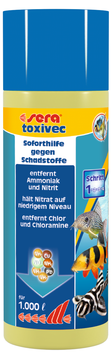 Door destabiliserende factoren (o.a. overvoeding, een hoge bezettingsgraad, een nieuwe inrichting, uitgebreide reinigingen maatregelen of het gebruik van geneesmiddelen), kunnen er in het aquariumwater plotseling massale belasting pieken met vis toxisch schadelijke stoffen als ammoniak, nitriet ontstaan. sera toxivec verwijdert in zulke noodsituaties deze giftige stoffen direct, evenals andere gevaarlijke substanties als chloor en zware metalen.