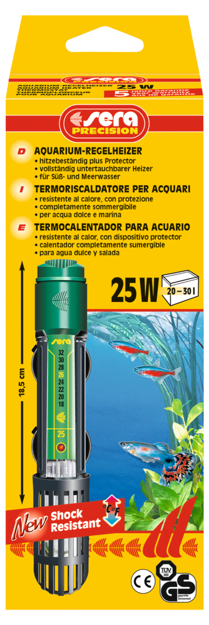 sera aquarium-regelverwarmingen zijn geschikt voor zoet- en zeewater. Ze zijn kort en compact en kunnen derhalve probleemloos in bijna gebruikelijke aquariums recht worden geïnstalleerd. Een temperatuurschaal dient als richtwaarde voor de voorinstelling. Het instelbereik ligt bij het wattage conform de tabel op de verpakking tussen 18 – 32 °C (65 – 89 °F), indien het aquarium is afgedekt. De Sera heater is gemaakt van slagvast glas en voorzien van een kunststof ombouw voor maximale veiligheid.