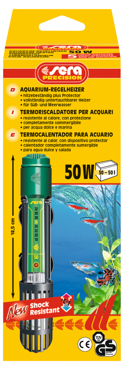 sera aquarium-regelverwarmingen zijn geschikt voor zoet- en zeewater. Ze zijn kort en compact en kunnen derhalve probleemloos in bijna gebruikelijke aquariums recht worden geïnstalleerd. Een temperatuurschaal dient als richtwaarde voor de voorinstelling. Het instelbereik ligt bij het wattage conform de tabel op de verpakking tussen 18 – 32 °C (65 – 89 °F), indien het aquarium is afgedekt. De Sera heater is gemaakt van slagvast glas en voorzien van een kunststof ombouw voor maximale veiligheid.