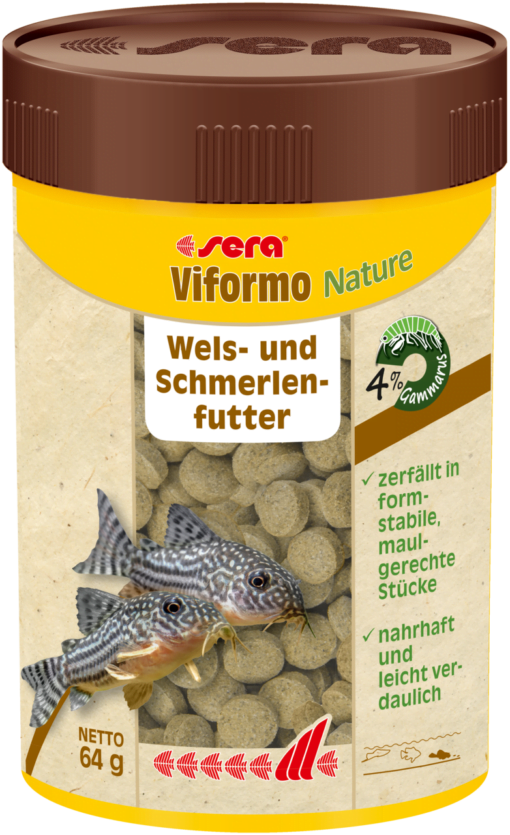 Sera viformo nature is het meervalvoeder zonder kleurstoffen en conserveringsmiddelen van behoedzaam vervaardigde tabletten voor bodemmeervallen en andere bodemvissen. Het voedzame en licht verteerbare voer bevat 4% Gammarus als hoogwaardige bron van eiwitten en mineralen. Gammarus is ook rijk aan sporenelementen en carotenoïden. De uitgebalanceerde receptuur, verrijkt met zeewier rijk aan vitamines, bevordert de gezonde ontwikkeling en vitaliteit van de dieren. Omdat de zinkende lipjes tijdens het graven uiteenvallen in hapklare stukjes, is een soort specifieke voeding van vissen met een kleinere bek (bijv. pantsermeervallen of modderkruipers) gegarandeerd. De voerdeeltjes blijven compact en vertroebelen het water niet.