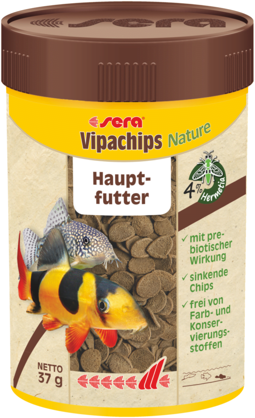 Sera Vipachips Nature is het hoofdvoeder van snel dalende chips zonder kleur- en conserveermiddelen voor alle van de bodem etende vissen. Met insectenmeel bevat het een hoogwaardige proteïnebron, die bovendien ressourcen besparend is. De uitgebalanceerde receptuur met natuurlijke ingrediënten en prebiotica maakt een bijzonder natuurlijke voeding mogelijk, die de gezonde groei en een krachtige ontwikkeling bevordert. De snel dalende chips blijven lang stabiel van vorm en vervullen zo optimaal de eetgewoonten van de bodemvissen zonder het water te belasten.