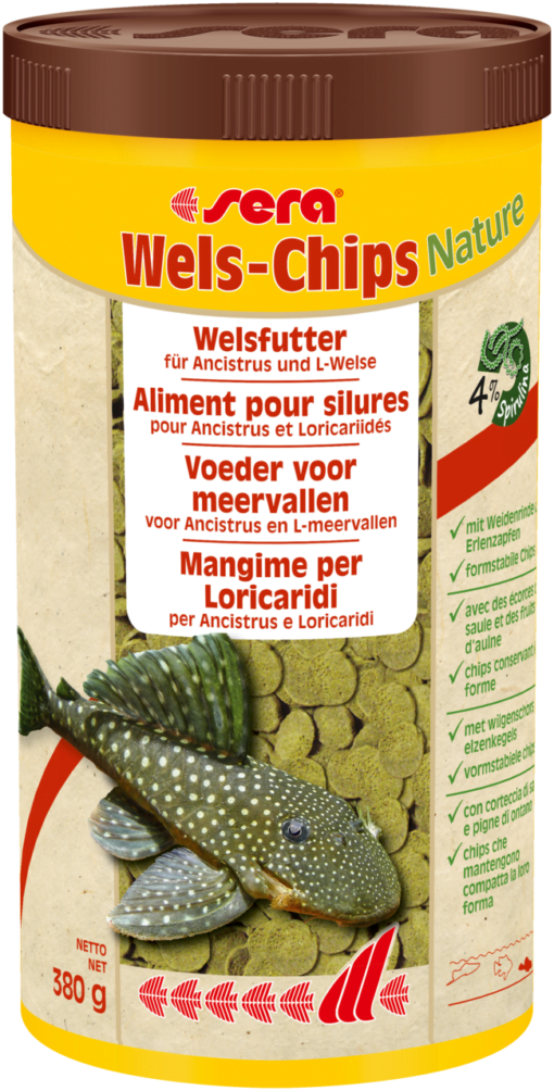 sera Catfish Chips Nature is het hoofdvoeder zonder kleurstoffen en conserveermiddelen voor het raspen en zuigen van bodemvissen zoals Ancistrus en L-meerval. De uitgebalanceerde receptuur met een hoog vezelgehalte (waaronder vezels uit wilgenbast en elzenkegels) en natuurlijke spirulina ondersteunt een gezonde spijsvertering en ontwikkeling. De snel zinkende spanen, die soepel worden in water, blijven minimaal 24 uur vormvast en vervuilen het water niet. Hierdoor kunnen de meervallen, die overwegend nachtdieren zijn, langzaam en in overeenstemming met hun natuurlijke eetgewoonten eten.
