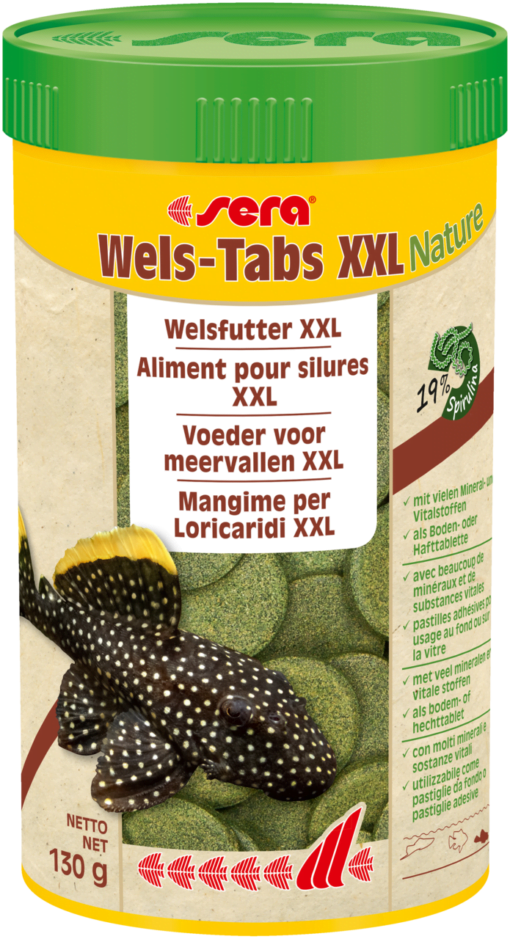 Sera Catfish Tabs XXL Nature is het hoofdvoeder zonder kleurstoffen of conserveringsmiddelen voor grotere meervallen (bijv. Plecos) en andere bodemvissen. De grote lipjes kunnen ook aan de aquariumruit worden bevestigd. Deze manier van voeren biedt fascinerende mogelijkheden om de meest uiteenlopende soorten siervissen te observeren.