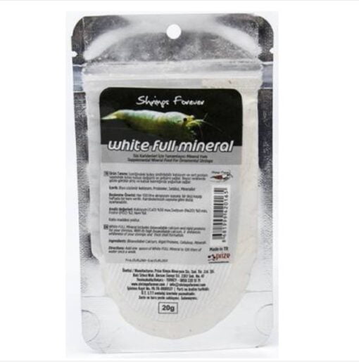 hrimps Forever white full mineral is een rijke mix van mineralen en ongebonden calcium. Dit ongebonden calcium wordt zeer gemakkelijk door garnalen opgenomen als aanvullend voer, waardoor de kleuring wordt versterkt. De calcium zorgt op natuurlijke wijze voor het verhogen en versterken van het witte pigment waardoor de witte kleur veel intenser wordt.