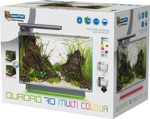 De Superfish Quadro 70 is een modern aquarium, ontworpen voor gebruiksgemak en ideaal voor mensen die op zoek zijn naar een mooi aquarium, maar weinig tijd willen besteden aan het onderhoud. Het geïntegreerde filtersysteem houdt het aquariumwater schoon en is voorzien van ruimte voor de aquariumverwarmer die daarmee veilig en uit het zicht kan worden gemonteerd. De Quadro is stijlvol in ieder interieur en word compleet geleverd met ingebouwd filter, duurzame veilige LED verlichting, een slim kabelgeleidersysteem aan de achterzijde en een glazen afdekruit die voorkomt dat vissen uit het aquarium springen.