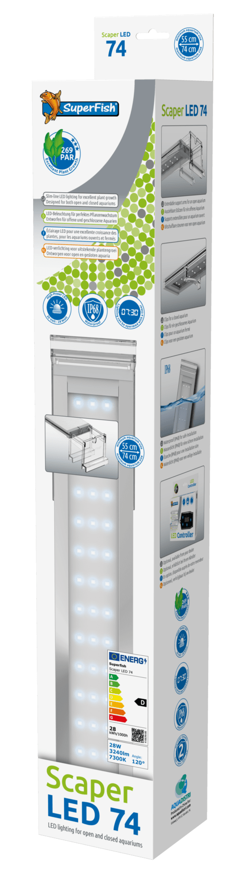 De Superfish Scapers LED is een krachtige aquariumverlichtingsoplossing voor zowel gesloten als open aquaria, speciaal ontworpen om de schoonheid van je aquatische wereld tot leven te brengen. Met zijn innovatieve design en hoge lichtopbrengst (269 PAR) biedt deze verlichting een optimale omgeving voor zowel de groei van aquariumplanten als het welzijn van je vissen. Of je nu een beginner bent of een doorgewinterde aquariumliefhebber, de Superfish Scapers LED biedt functionaliteit en esthetiek in één. De Superfish Scapers LED komt met uitschuifbare clips voor verplaatsing op de glasrand( max 10mm dik). Tevens hebben ze clips voor plaatsing van de Superfish Scapers LED voor een aquarium met gesloten kap. De Superfish Scapers LED 74 heeft een lengte van 54.5 cm en kan geplaatst worden op aqauria van 55 tot en met 74 centimeter.