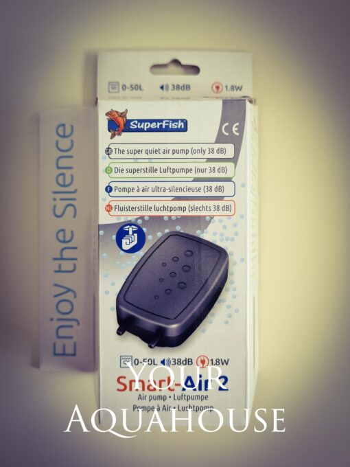 De Superfish smart air 2 is een stille luchtpomp ( 38db) die zorgt voor waterbeweging in het aquarium wat belangrijk is voor de zuurstofopname.. De Superfish smart air eenvoudig te installeren op het aquarium door de geïntegreerde zuignap. Hierdoor kunt u de luchtslang zeer kort houden. Door de speciale constructie kan het membraan niet vervangen worden en deze gaat ongeveer 1 jaar mee. De Smart-Air is onderhoudsvrij en geschikt voor de kleinere aquaria tot 50 liter.